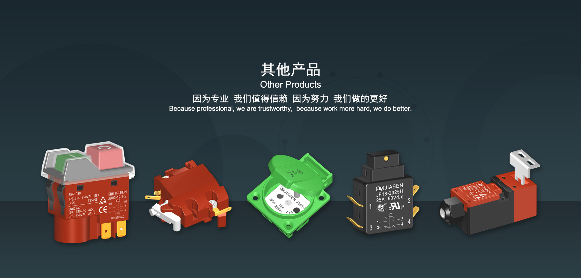 浙江佳奔電子有限公司始建于1986年,坐落于浙江省樂(lè)清市虹橋鎮(zhèn)東電子信息產(chǎn)業(yè)園內(nèi),現(xiàn)有職工700多人,資產(chǎn)總額超3億元。公司主要經(jīng)營(yíng)“JIABEN”牌微動(dòng)開(kāi)關(guān)、蹺板開(kāi)關(guān)、按鈕開(kāi)關(guān)、扳機(jī)開(kāi)關(guān)、調(diào)速開(kāi)關(guān)和電位器開(kāi)關(guān)等各類交、直流器具開(kāi)關(guān)和各類交、直流線路板模塊等產(chǎn)品,主要應(yīng)用于交、直流電動(dòng)工具、電動(dòng)園林工具、清潔器具、家用電器和小型機(jī)床等行業(yè),是集產(chǎn)品設(shè)計(jì)、研發(fā)、制造、銷售和服務(wù)于一體的國(guó)家高新技術(shù)企業(yè)。JIABEN was founded in 1986, located in East Electronic Information Industry Park, Hongqiao Town, Yueqing City, Zhejiang Proviance, existing staff more than 700 peoples, more than 300 million RMB worth of assets. Company is mainly engaged in "JIABEN" brand Micro Switch, Rocker Switch, Push-button Switch, Trigger Switch, Speed Regulating Switch, Potentiometer Switch and other kinds of appliance switch and all kinds of AC or DC circuit board module, such as more than 100 series, 8000 kinds of models of products, mainly used in AC or DC Power-tools, Power Gardening Tools, Cleaning Appliances, Household Appliances and Small Machine Tool and other industries, is the collection product design, research and development, manufacturing, sales and service in one of the national high and new technology enterprise.
